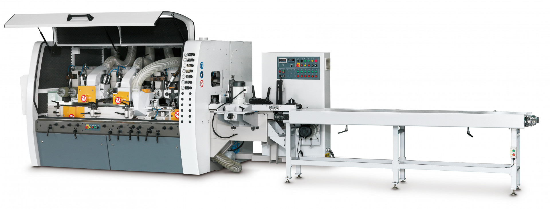 GAU JING GN Shortpiece series 4 side planer & moulder offer unbeatable accuracy and productivity designed for planing short pieces. The cast iron construction is designed and engineered to meet industry requirements for medium production and fine surface effect. It promises dramatic performance gains with many fine features: Rugged constructed throughout for maximum stability; High precision spindle creates extremely fine surface effect; Centralized air pressure regulations and centralized lubrication system for added convenience. The machine feeding speed is up to 60m/min saving a lot of working time. Special with automatic chain type feed machine (with 3M conveyer) which is fluent and fast feeding for the short pieces.